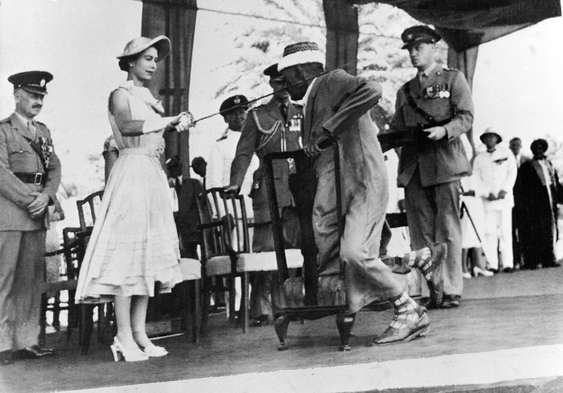 Yemen Councillor Sayyid Abubakr bin Shaikh Alkaff kneels before the queen to be knighted during a visit to Aden on 29 April 1954 (AFP).
