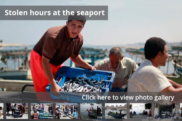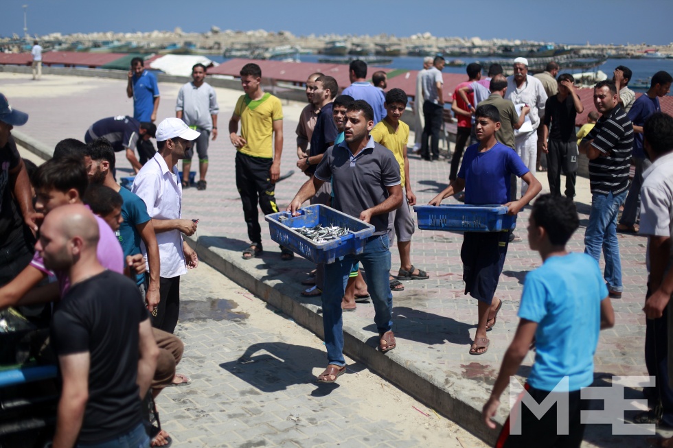 Fishermen load a rare catch at Gaza's seaport amid a ceasefire (MEE / Hosam Salem)