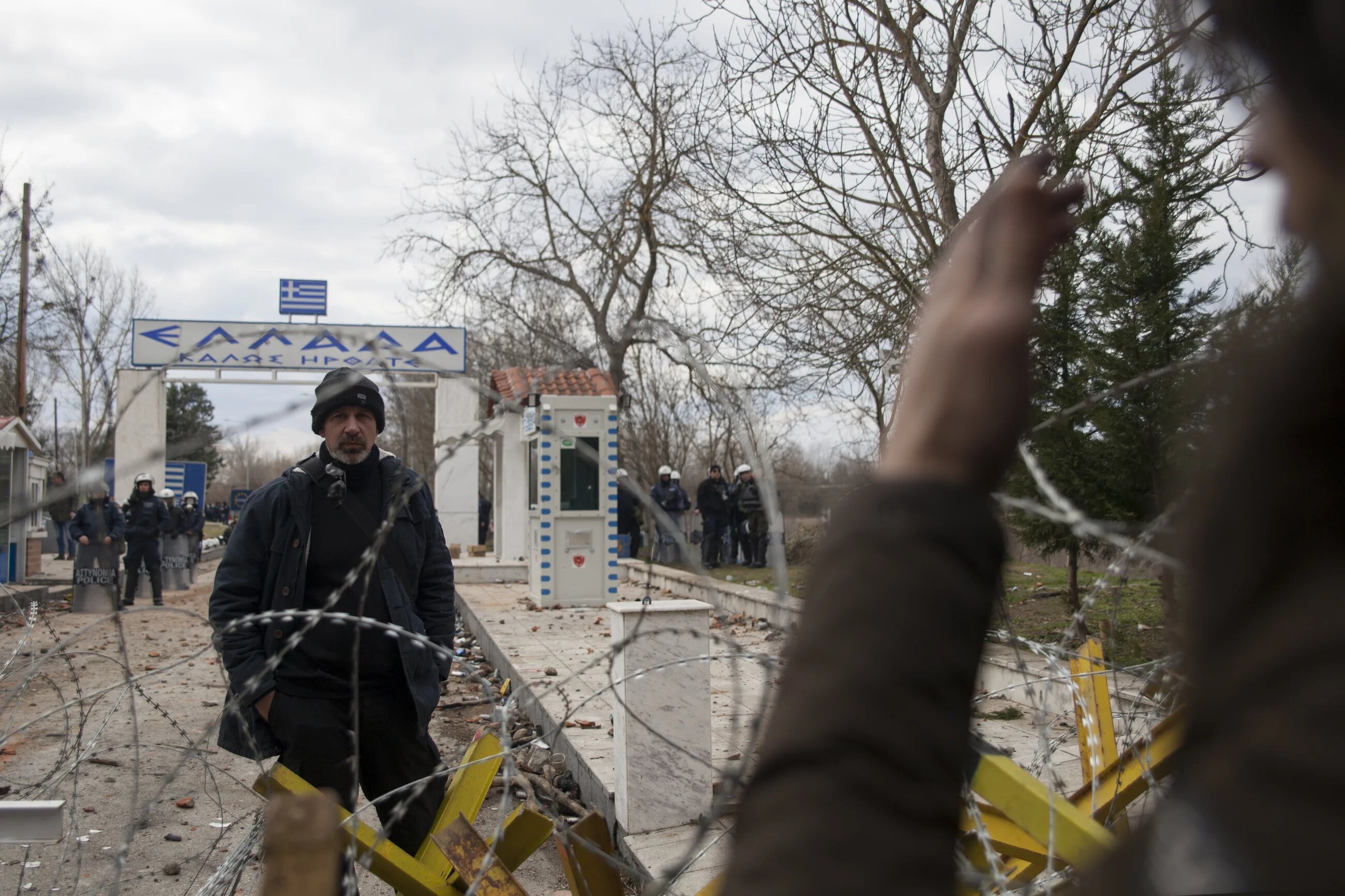 A refugee attempts to reason with a plain clothes guard on the Greek side of the border with Turkey. The refugee took on a diplomatic role among the crowd as he spoke English, asking for bottles of water and bringing attention to their needs. As a result of the new crisis at its borders, Greece has announced it will not be accepting any new asylum applications for one month (MEE/Tessa Fox)