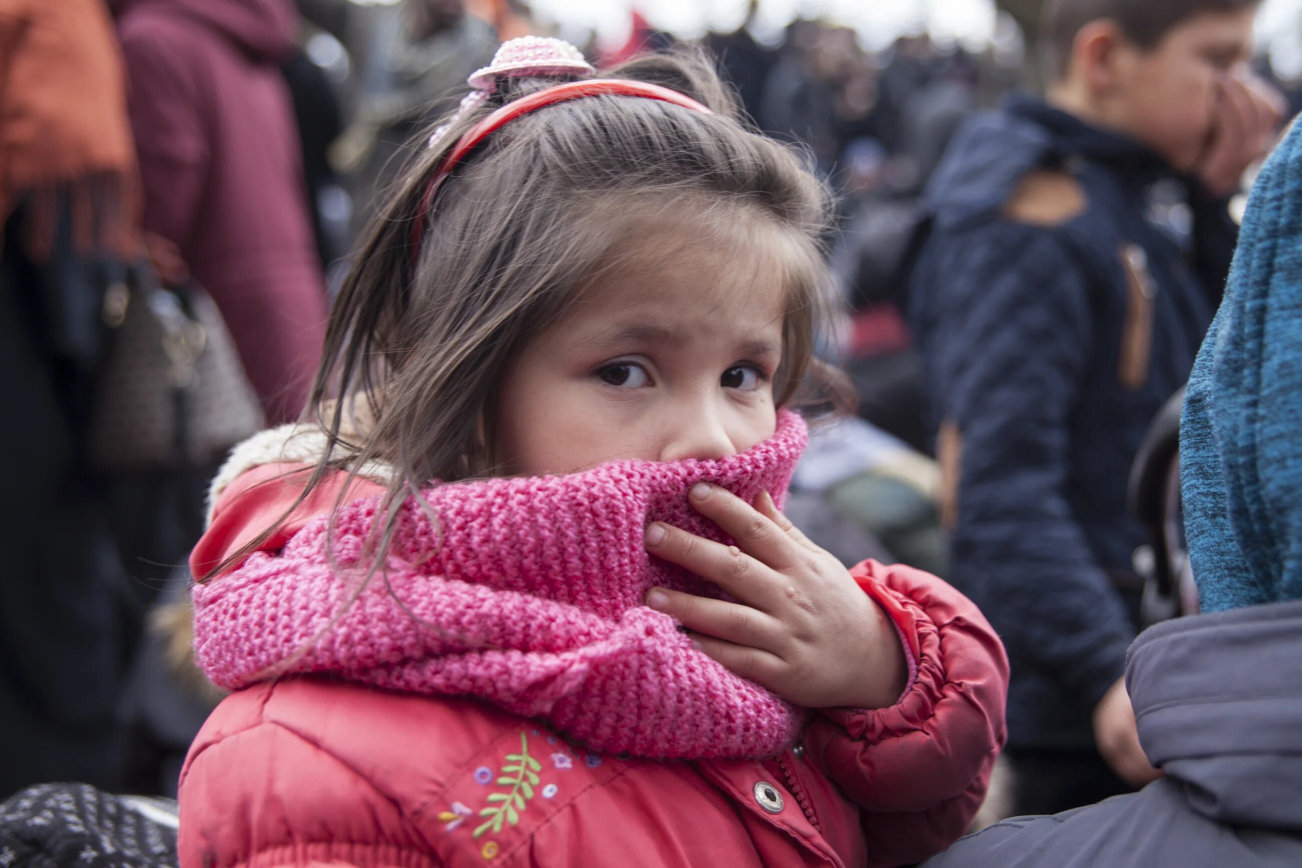 Young children suffer from tear gas inhalation, fired by Greek border patrol guards, and from the smoke from fires burnt to keep warm at the Greek-Turkish border crossing. On Monday, the Greek government announced it would begin using live fire to control its land and sea borders. Turkish Interior Minister Suleyman Soylu told the Greek authorities on the same day to show "humanity" (MEE/Tessa Fox)