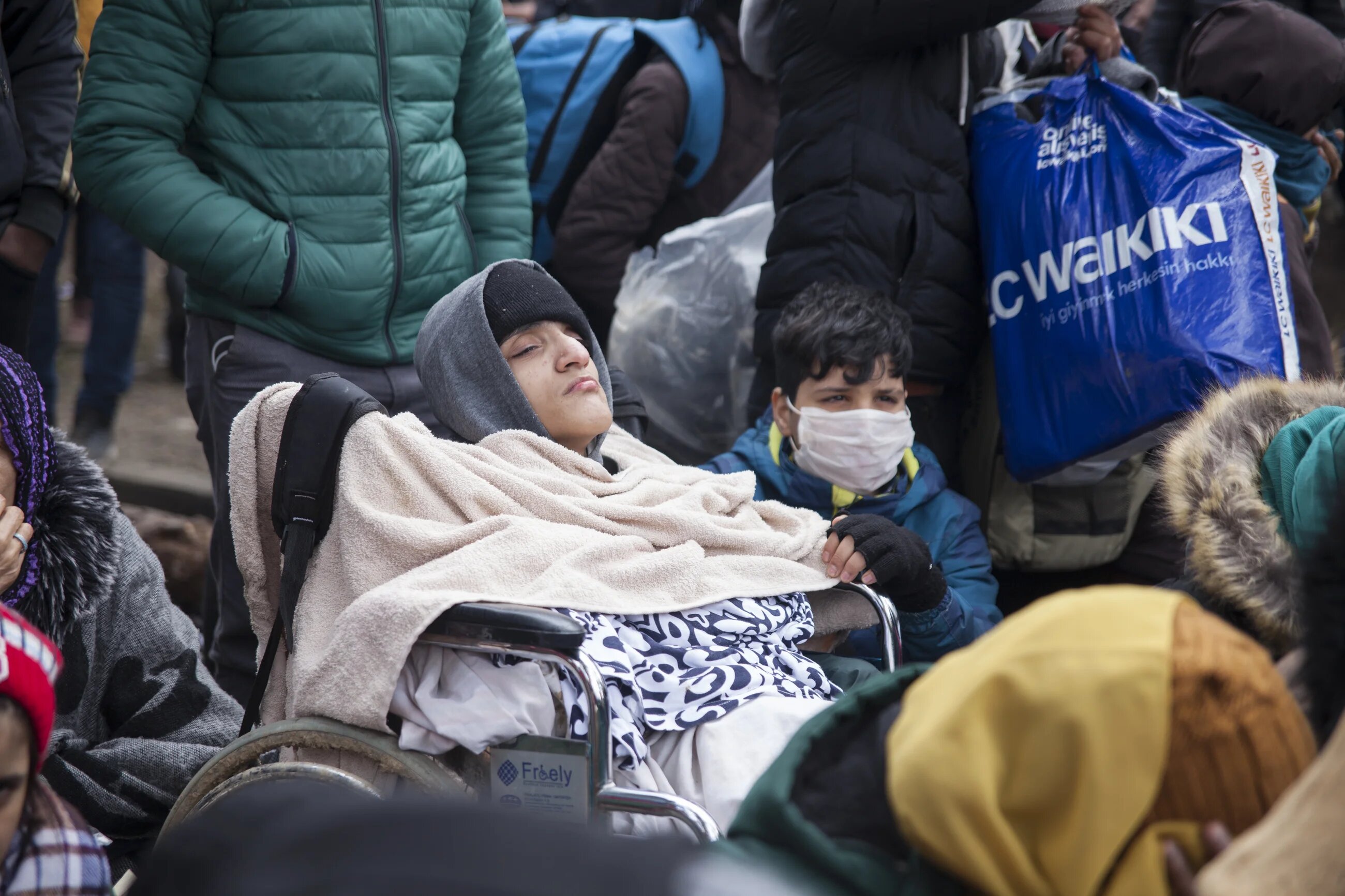 People in wheelchairs and those with illnesses were also present at the Pazarkule crossing, attempting to access healthcare in Europe, along with children in need of surgery. One Afghan woman explained to MEE that her son required two different surgeries for his teeth, which visibly looked like they were rotting behind a hair lip. "For my son I want to go to Greece. We have depression and stress here in Turkey," she said in a desperate tone (MEE/Tessa Fox)