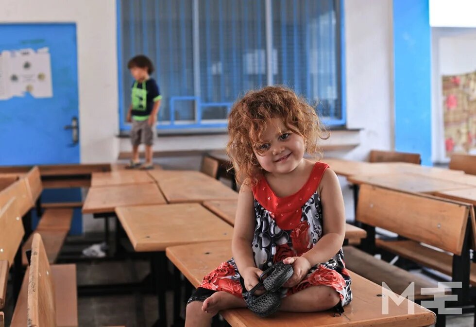 A child smiles to the camera at an UNRWA school turned shelter (MEE/Mohammed Asad)