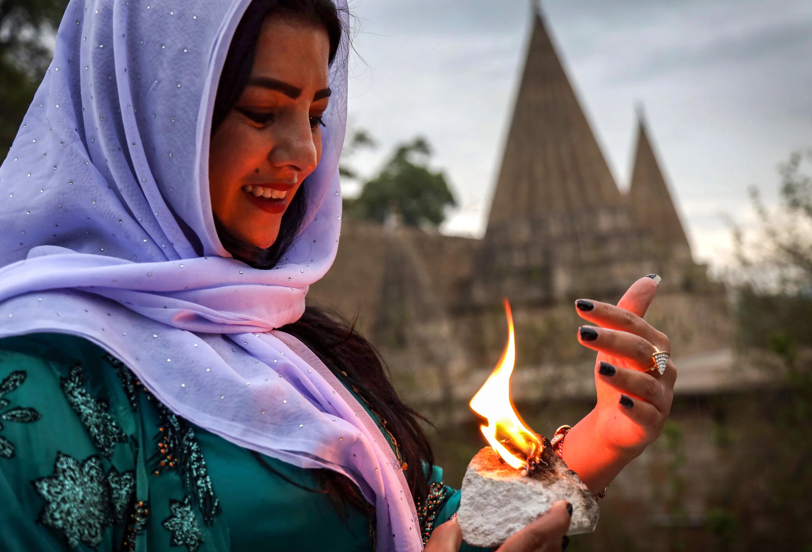 An Iraqi Yazidi woman holds a candle outside the Temple of Lalish which is believed to contain the tomb of Sheikh Adi ibn Musafir, the religion’s chief saint (AFP/Safin Hamed