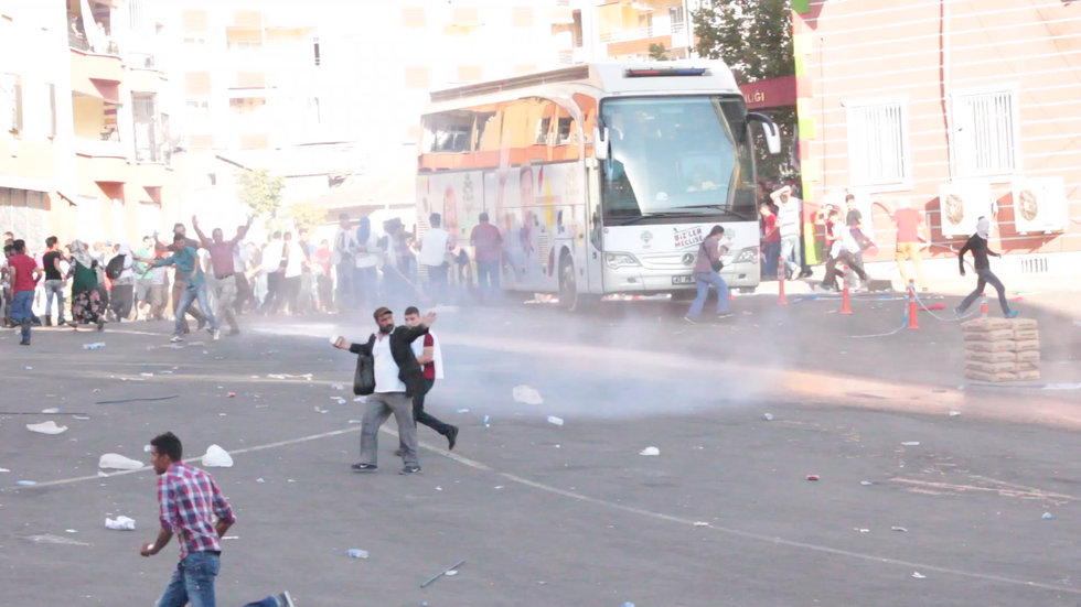 Hundreds assembled outside the headquarters of the HDP, with the intention of giving a send off to a campaign bus, which planned to travel from Diyarbakir to Gemlick in the east of the country.