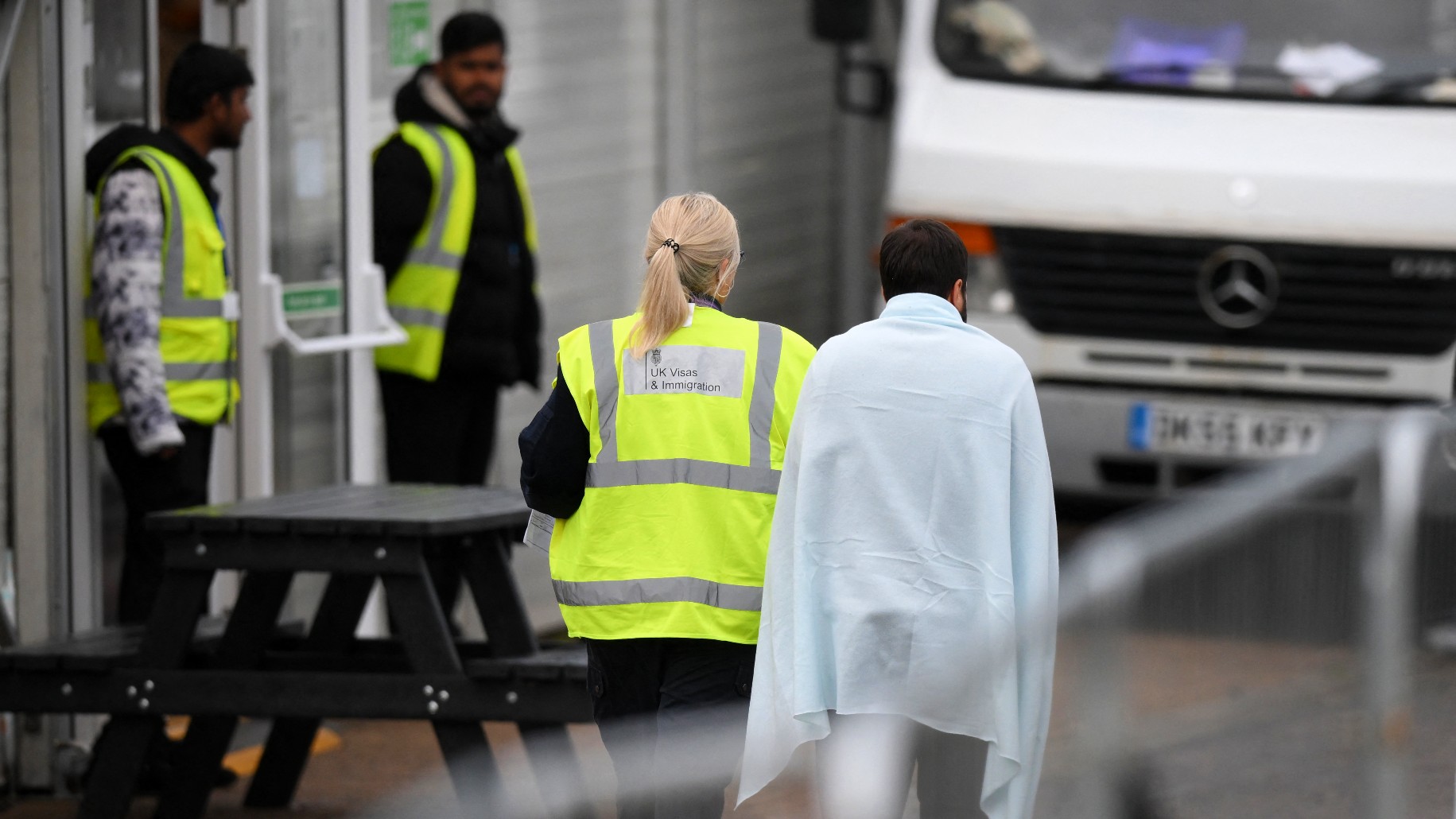 A detainee is escorted inside the Manston migrant processing centre in Kent, UK in November 2022: William Shawcross’s report advocates introducing Prevent in such facilities (AFP)