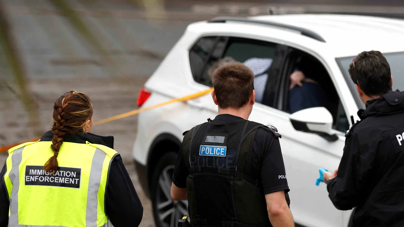 Immigration and police officers examine a car believed to have been used in an extreme-right attack on the Border Force processing centre in Dover in October 2022 (Reuters)