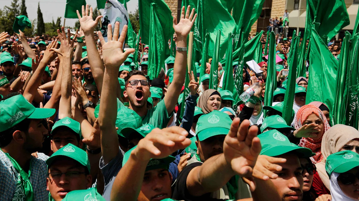 Palestinian students supporting the Hamas movement take part in an election campaign rally near Ramallah, West Bank, in April 2016 (AFP)