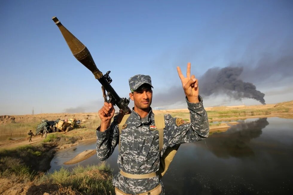 Member of Iraqi pro-government forces gestures as smoke billows in background during advance towards city of Fallujah (AFP)