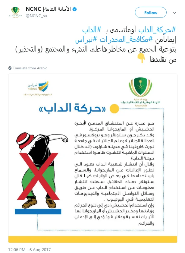 Translation: We stand by the National Commission #Nebras and warn our youth of drug abuse, and we were not aware of the meaning or intention of this move, and we are all together in the fight against drugs.