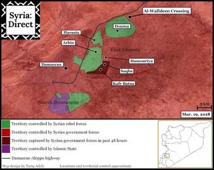 In Eastern Ghouta’s southern half, pro-government forces continued to advance over the weekend, seizing the towns of Saqba and Kafr Batna. On Monday, the Syrian Arab Army (SAA) announced a “precise military operation” on the frontline town of Hazza in the same area, state media outlet SANA reported.