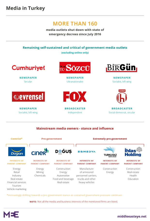 One of the first attempts targeting the Dogan Media Group was in 2009 when it was handed an unprecedented fine of 6.8bn lira ($2.4bn) for alleged tax evasion and fraud. The group and the relevant government body later reached an agreement and they settled for a four million lira ($1m) sum.
