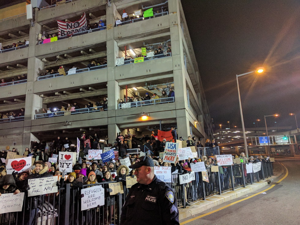 Hundreds of New Yorkers gathered at John F Kennedy International (JFK) airport to protest the temporary ban against people from Iraq, Syria, Iran, Libya, Sudan, Somalia and Yemen, and there were similar demonstrations at most major airports across America.