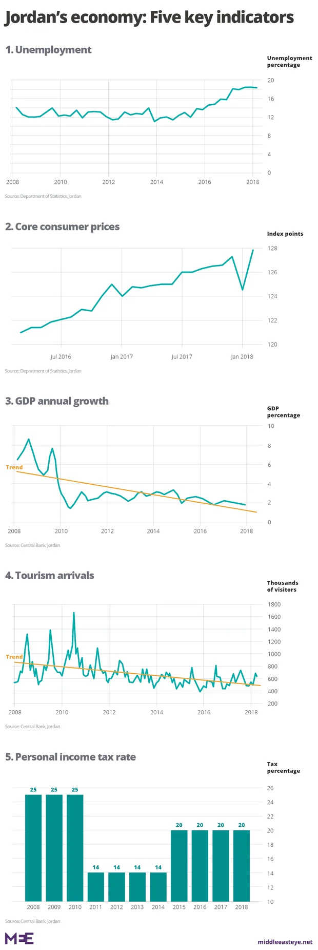 In 2016, Jordan secured a $723m, three-year credit line from the International Monetary Fund (IMF). Since then, austerity measures agreed with the IMF have caused the price of basic goods and services to rise steadily.