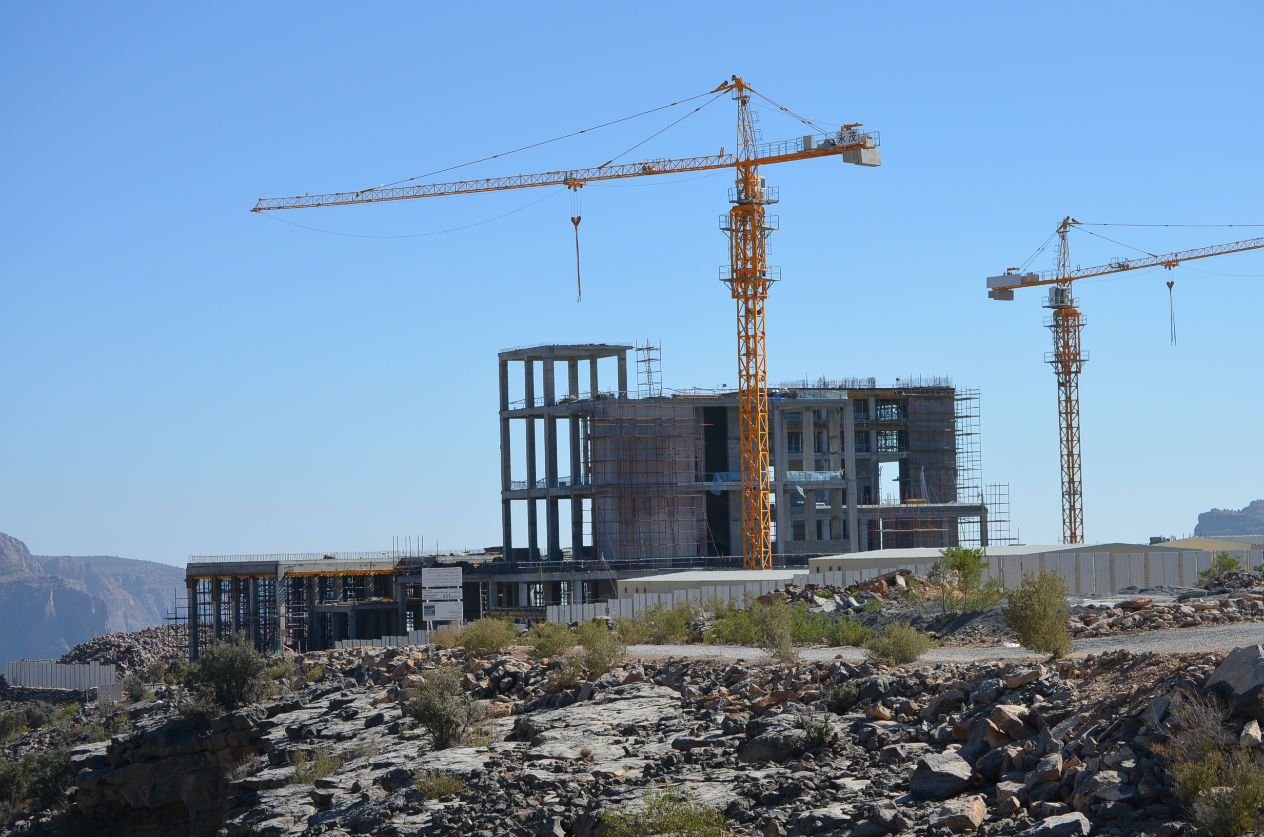The construction site of the mountain 'palace' for the Emir of Qatar Tamam bin Hamad Al Thani in Oman's Jebel al Akhdar mountains (MEE/Joe Gill)
