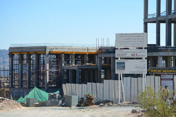 Companies listed on the board at the entrance to the construction site were Corduff Oman Architecture and General Engineering Technologies (GET) LLC.