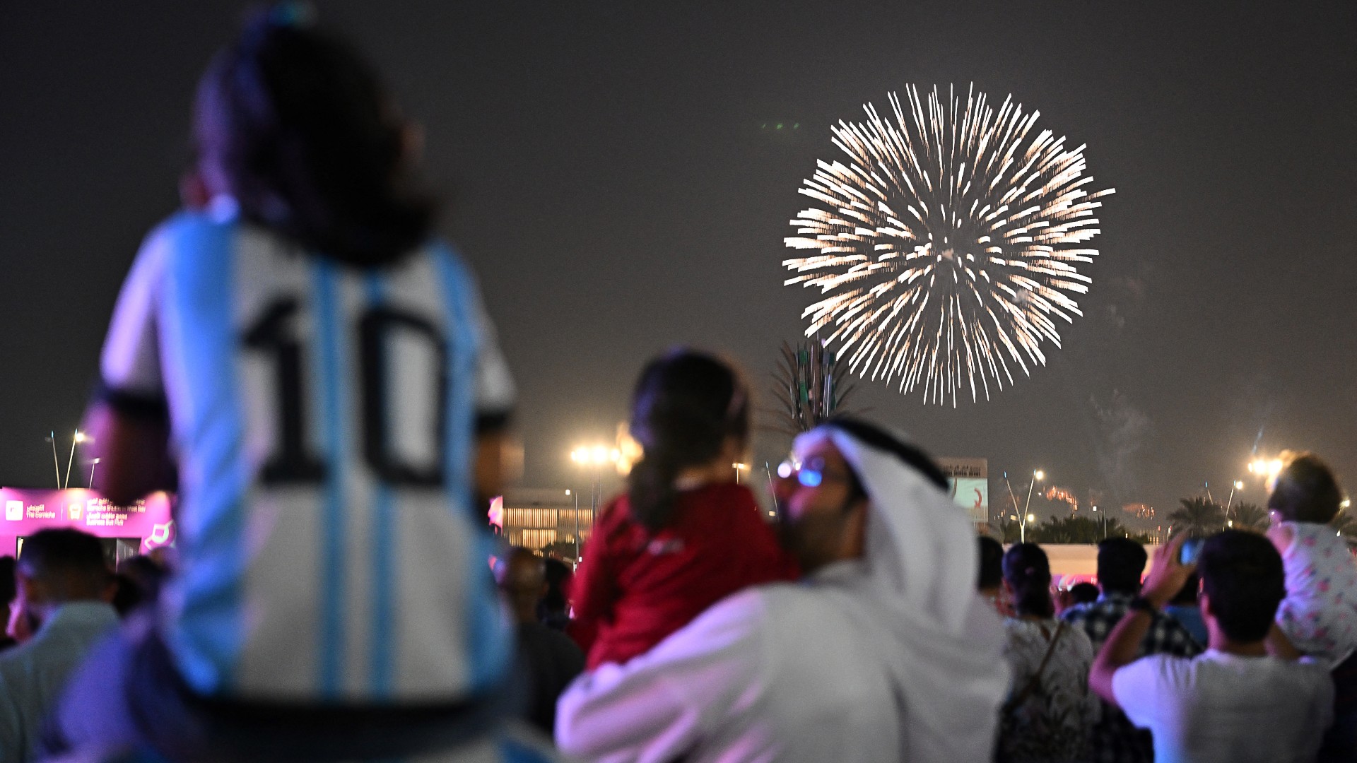 Iconic head coverings dominated Doha's corniche, as thousands of lovers of the beautiful game clamoured to get a look at the impressive fireworks display on the eve of the 2022 World Cup.