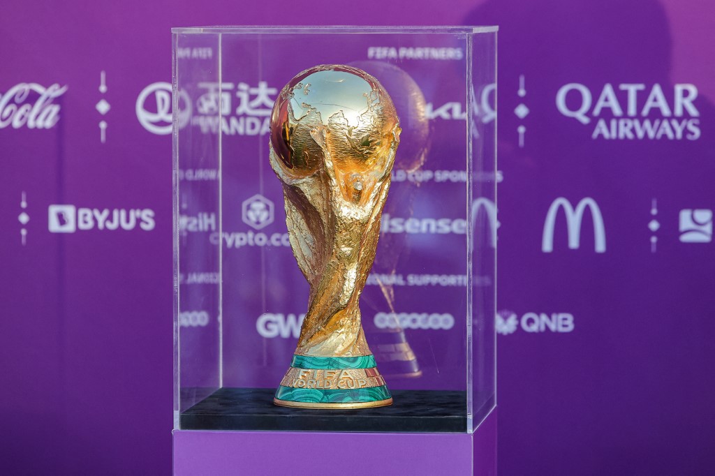 This picture taken on 10 May 2022 shows a view of the FIFA World Cup Trophy while on display at the Katara cultural village in Qatar's capital Doha (AFP)