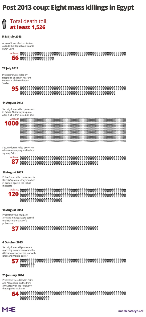 On 3 July 2018, marking the fifth anniversary of the coup, the Egyptian parliament approved a law that exempted senior army officers from prosecution for any acts committed since July 2013. That includes Rabaa and seven other mass killings.