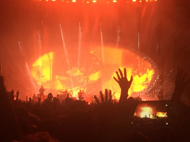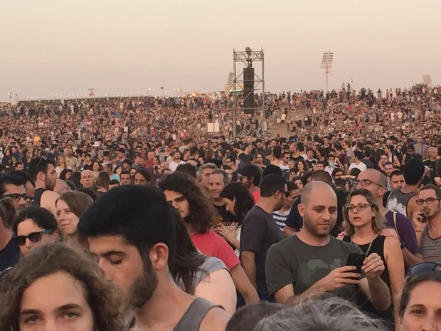 The rock group performed for nearly two and a half hours in the carnival-like summer atmosphere, with food stands, ferris wheels, and Tel Aviv’s skyscrapers in the distance.