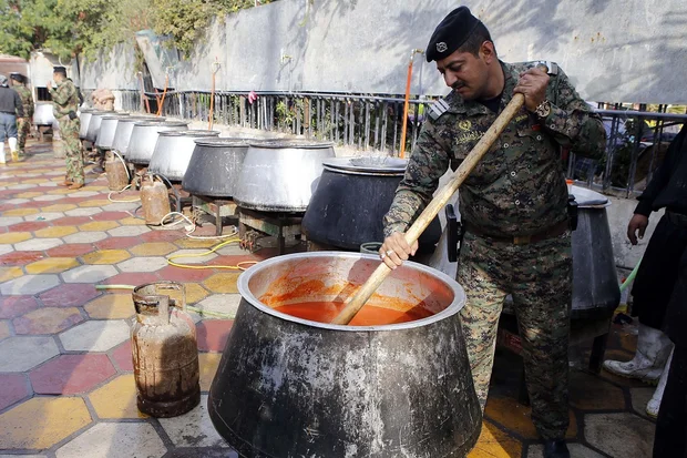 Worshipers often pray and chant but they also gather and feast together, with scores of tents and temporary shops and stalls opening up for the month-long build up. The municipality of Tehran has provided 60 rubbish trucks and 10,000 volunteer to help clean the tonnes of waste from the tens of thousands of meals served to the pilgrims.