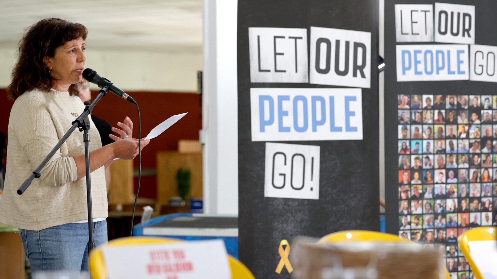 Released Israeli hostage Liat Beinin Atzili speaks at a passover ceremony in Nir Oz to call for the release of the remaining hostages on 11 April 2024 (Jack Guez/AFP)