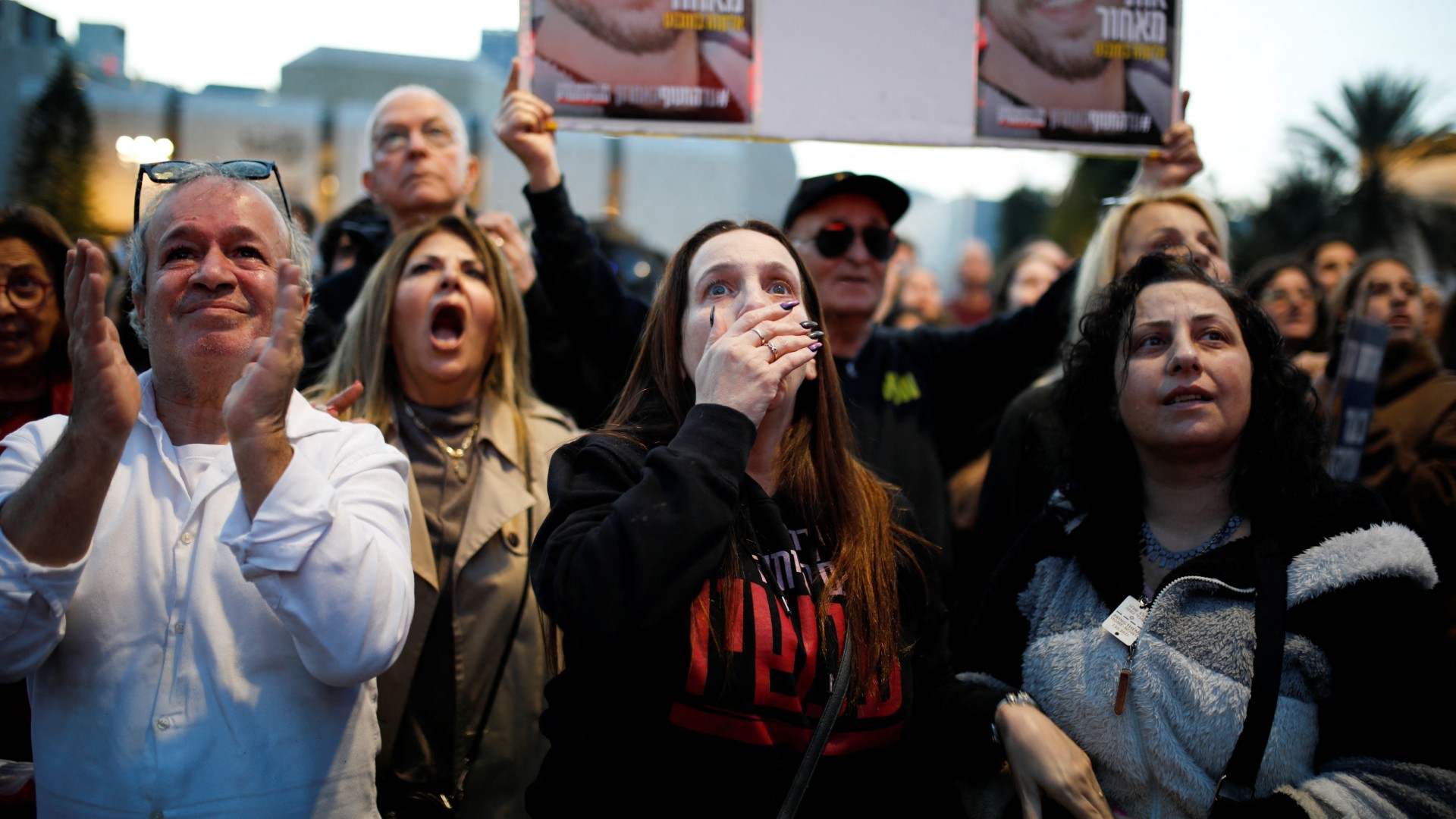 Thousands of Israelis gathered in Tel Aviv to watch the women’s release, with people sobbing with joy as the images were broadcast.