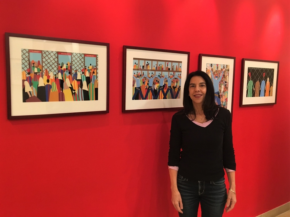 "I definitely identify with the idea of being forced to leave, but I do not consider myself a refugee in the sense that I had no choices, because I didn't have to go walk for miles and so on, in that kind of context," she said motioning to her artwork on the walls of the gallery depicting just that. "No, in that way I definitely am not."