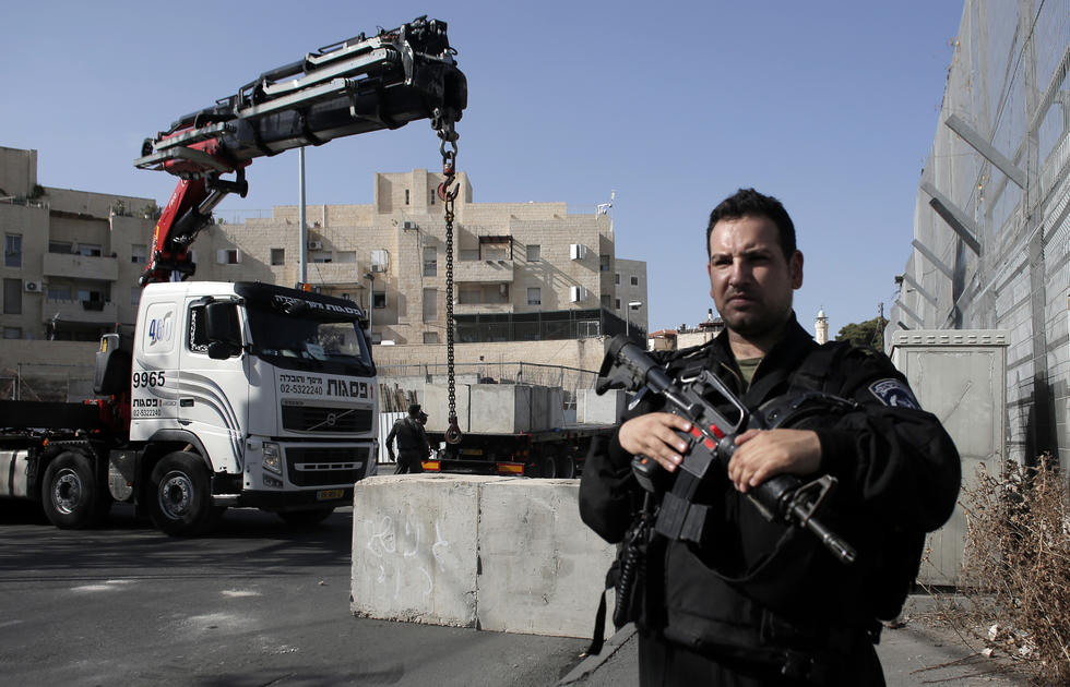 EAST JERUSALEM, Occupied Palestinian Territories - In Ras al-Amud, in occupied East Jerusalem, a crowd gathered on Wednesday at one of the Palestinian neighbourhood's few entrances. Some 20 Israeli police officers guarded the area as workers operated a large crane that lowered concrete blocks on the road.
