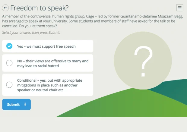 A case study included in the presentation poses the question of whether a speaker from Cage, the advocacy organisation of which Begg is a director, should be allowed to speak on campus.