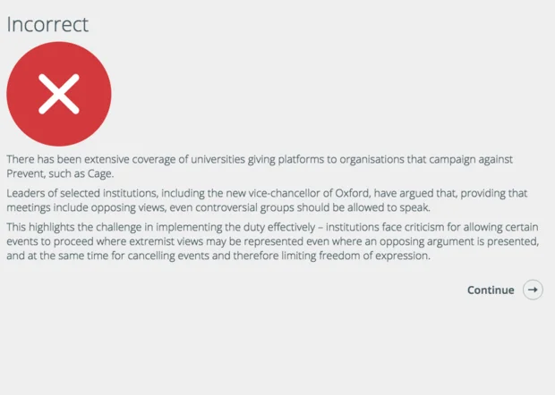 While the presentation advises that a Cage representative should be allowed to speak "with appropriate mitigations in place", those who choose the answer "Yes - we must support free speech" are told that such a view is "incorrect".