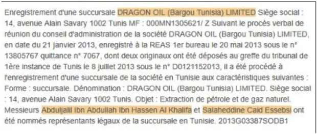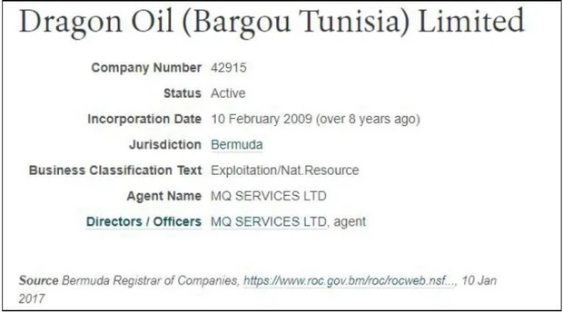 Dragon Oil (Bargou Tunisia) Limited, of which Essebsi is the legal representative, is registered in Bermuda and is a subsidiary of Dragon Oil (holdings) Limited.