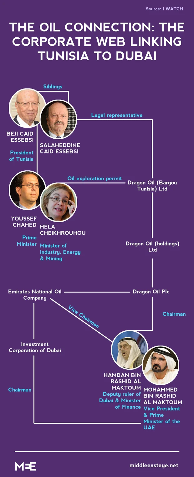 During their investigation, I WATCH discovered that the legal representative of Dragon Oil's Tunisian branch is Salaheddine Caid Essebsi, brother of the Tunisian president, and uncovered links to Dubai's ruling Al-Maktoum family.