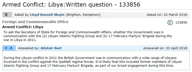 “During the Libyan conflict in 2011 the British Government was in communication with a wide range of Libyans involved in the conflict against the Gaddafi regime forces. It is likely that this included former members of Libyan Islamic Fighting Group and 17 February Martyrs Brigade, as part of our broad engagement during this time,” said Foreign Office minister for the Middle East Alistair Burt, in a written response to a parliamentary question, which was published just after MPs rose for their Parliamentary break at Easter.