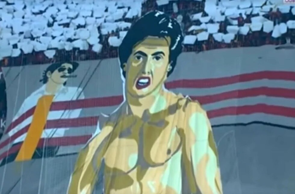 Rocky Balboa rises from the crowd. The banner took fans a month to create (screengrab)