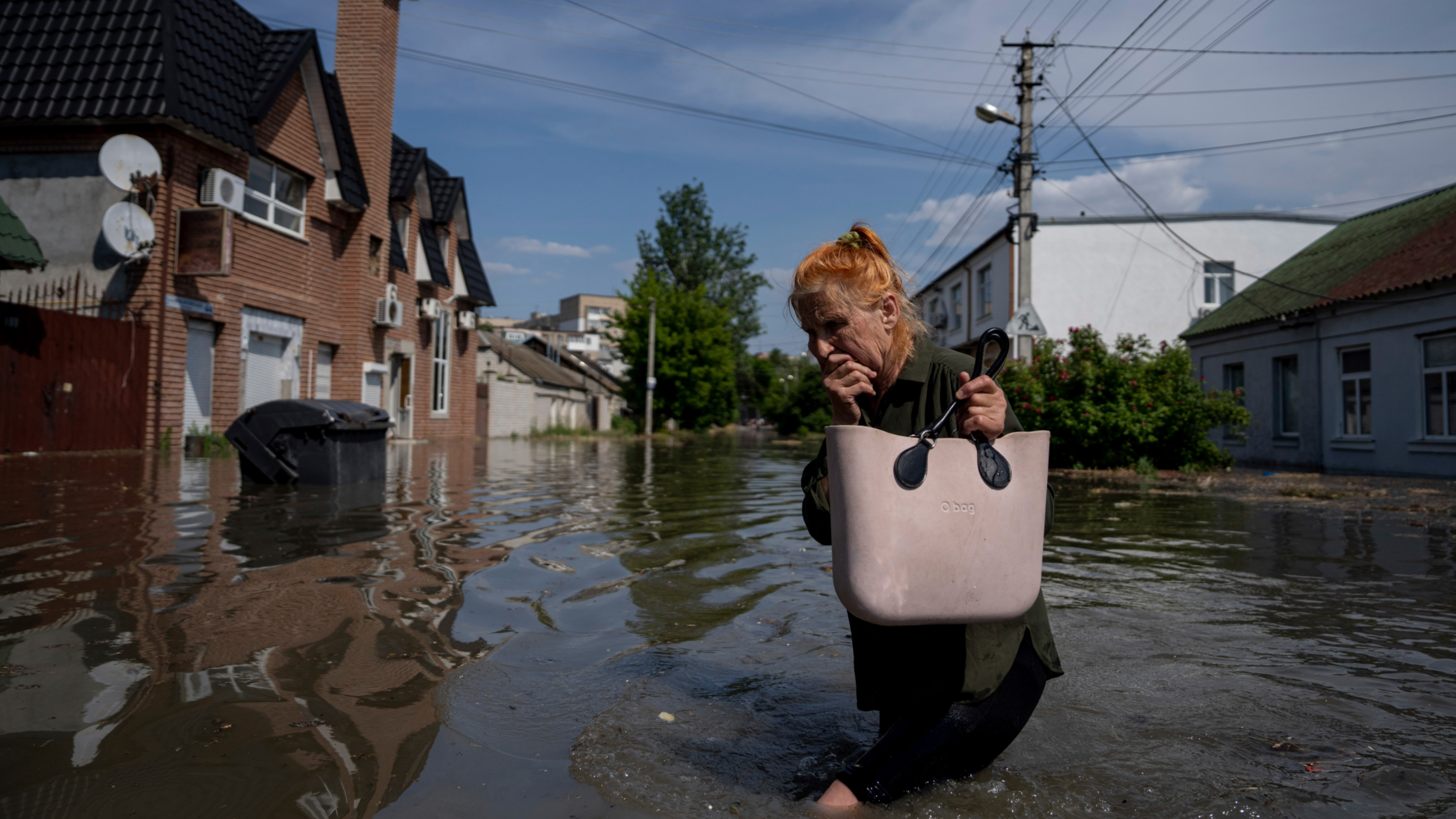 A local resident makes her way through a floodwater after the Kakhovka dam collapsed, Kherson, Ukraine, 6 June 2023 (AP)