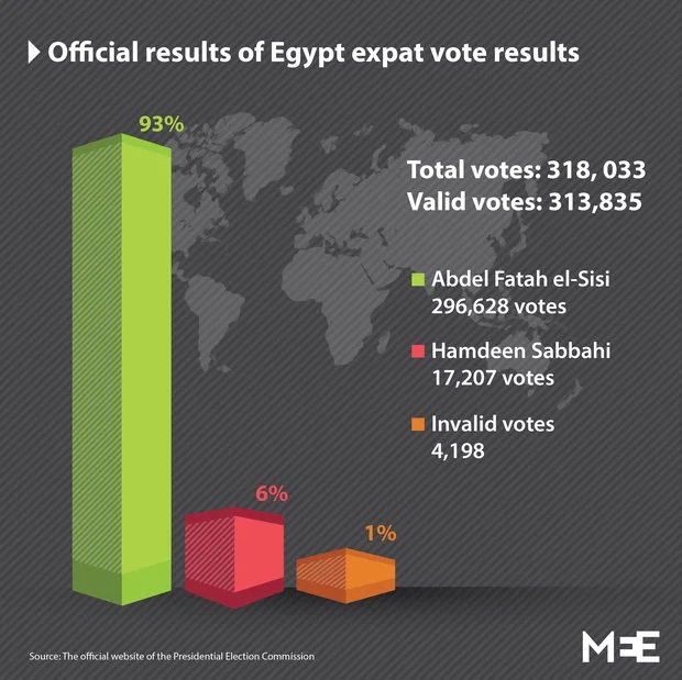 Observers expect al-Sisi to dominate the polls, especially after he secured an overwhelming 95.4 percent of the vote in expatriate polling last week, according to results announced by Egypt's electoral commission.