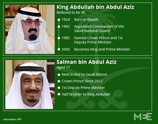 Abdullah's half-brother Salman, 77, is next in line to the throne. He was named crown prince in June 2012 following the death of Prince Nayef bin Abdul Aziz.
