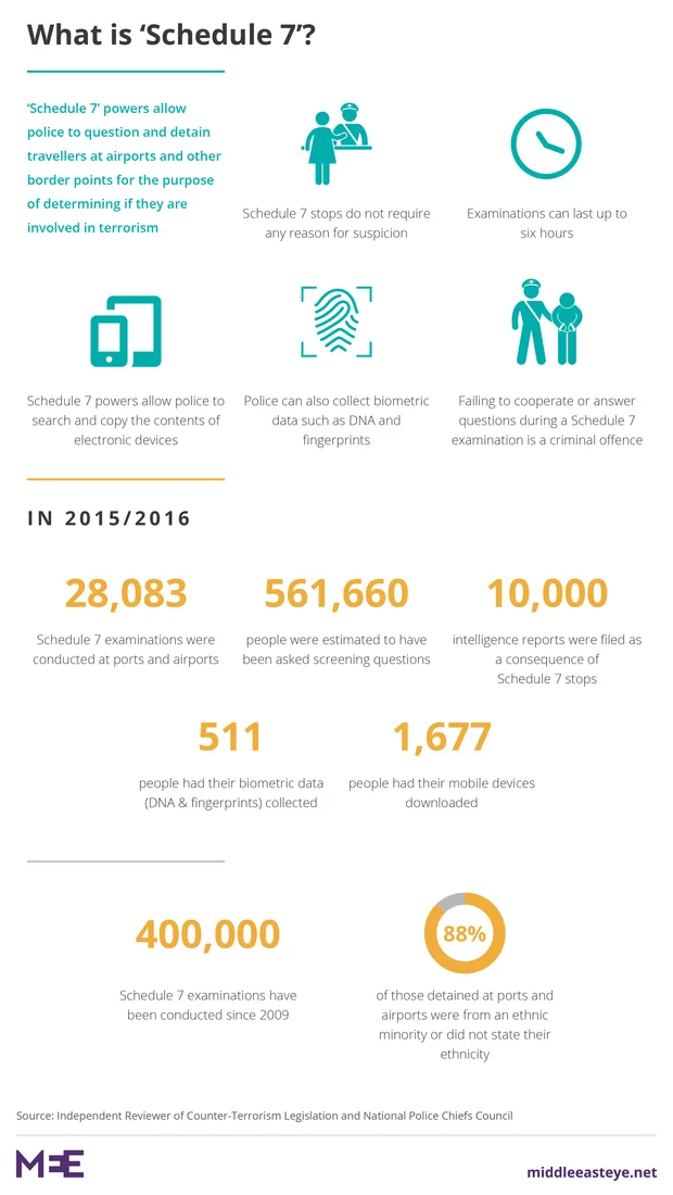 Introduced as part of the 2000 Terrorism Act, Schedule 7 gives police and some immigration officers the power to hold any person at an airport or port for six hours without any cause of suspicion, to determine if the individual could be a terrorist.