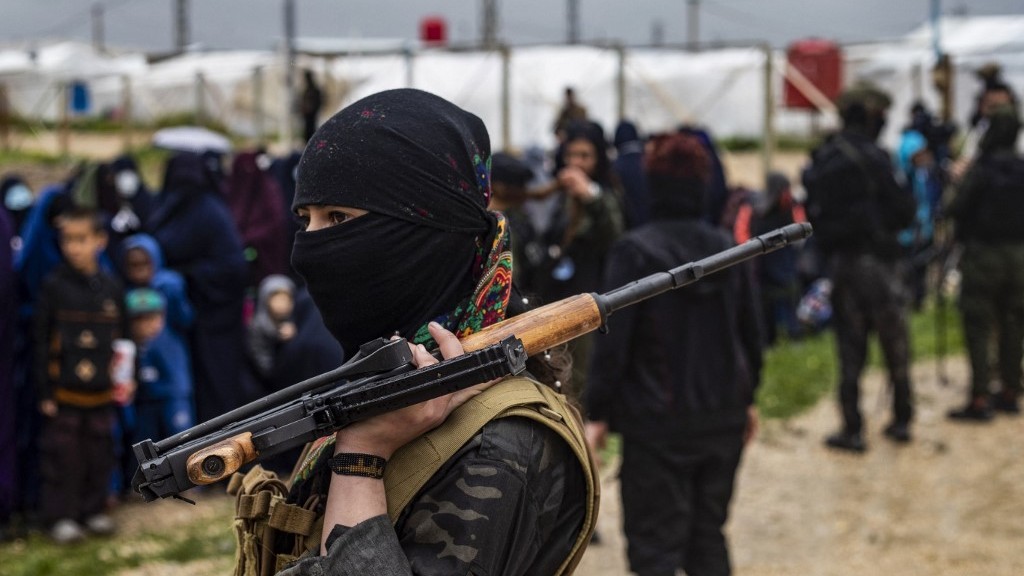 A woman fighter stands guard during a joint security operation for the Kurdish Internal Security Police Force, also known as Asayish, and the Kurdish-led Syrian Democratic Forces on 5 April 2025 (Delil Souleiman/AFP)
