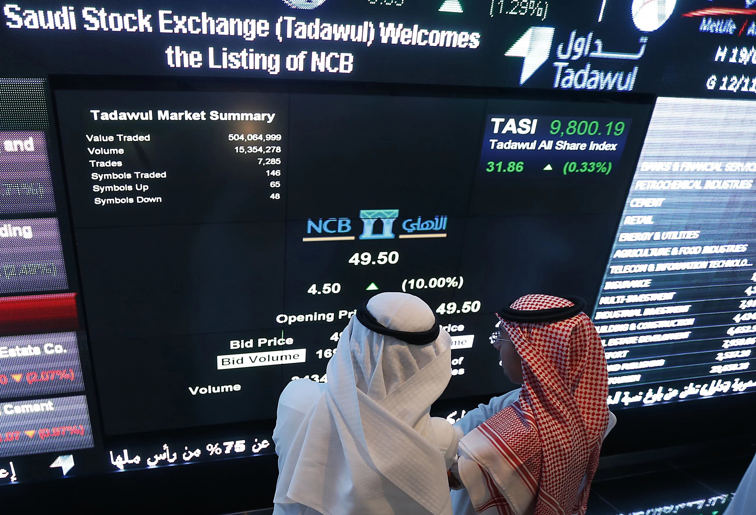 Saudi investors monitor stocks at the exchange market department at the National Commercial Bank (NCB) in Riyadh (AFP)
