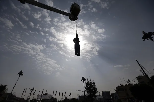 Muhammad al-Maghribi and Hussein al-Saket were each shot in the back with automatic fire. Maghribi was whipped before he was killed. Saket’s body was hoisted into the air by crane after he had been shot for the gathered crowd of thousands to see.
