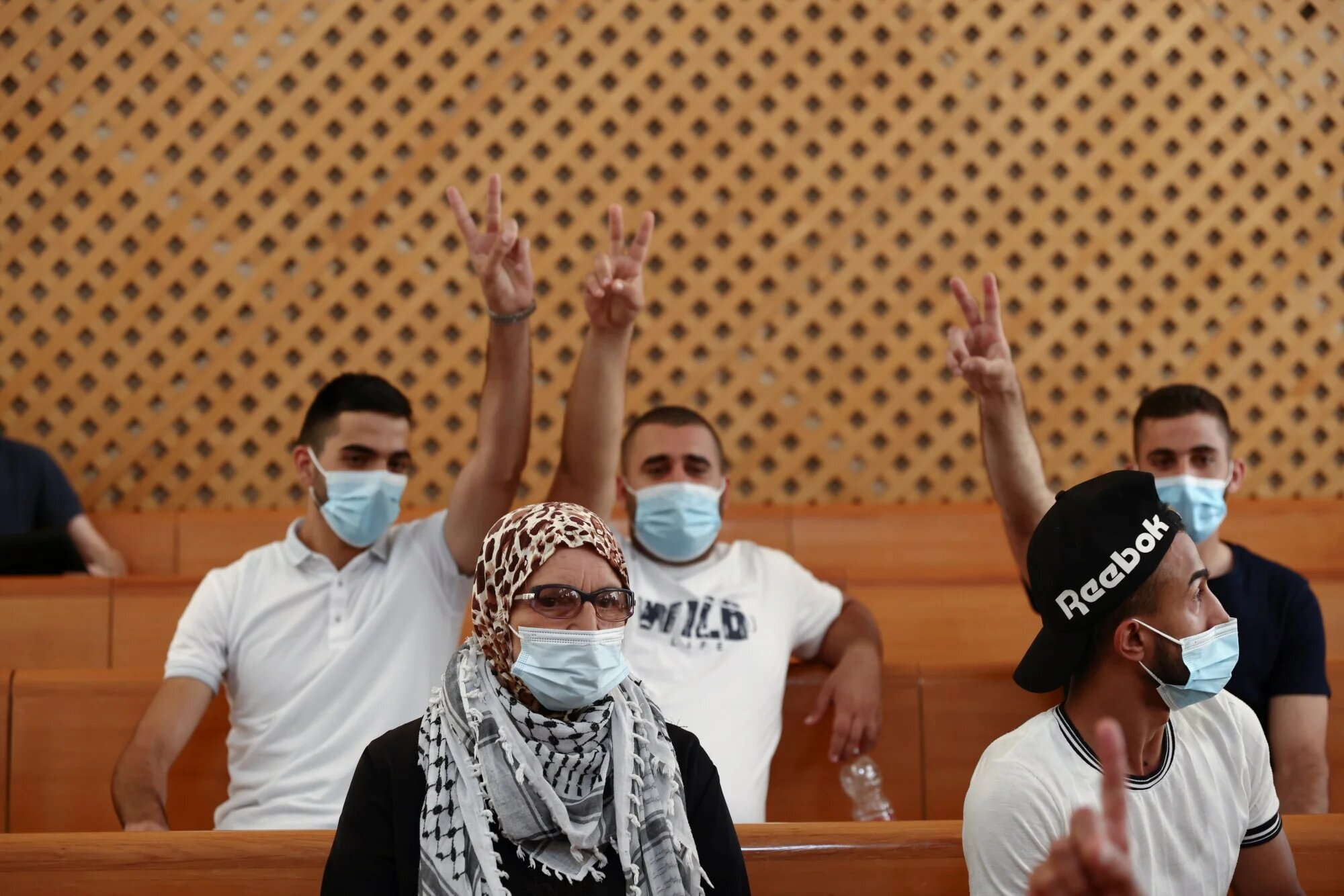 Members of the al-Kurd family, Palestinian residents of the Sheikh Jarrah neighbourhood who are facing expropriation, flash victory signs during a court hearing in the Israeli Supreme Court in Jerusalem on 2 August 2021 (Reuters)