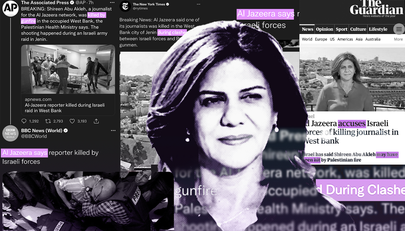 In its depiction of Abu Akleh's murder, The Guardian described Al Jazeera as having "accused" Israel of killing one of its journalists, immediately balancing this claim by platforming the Israeli position that the journalist "may have been hit by Palestinian fire".