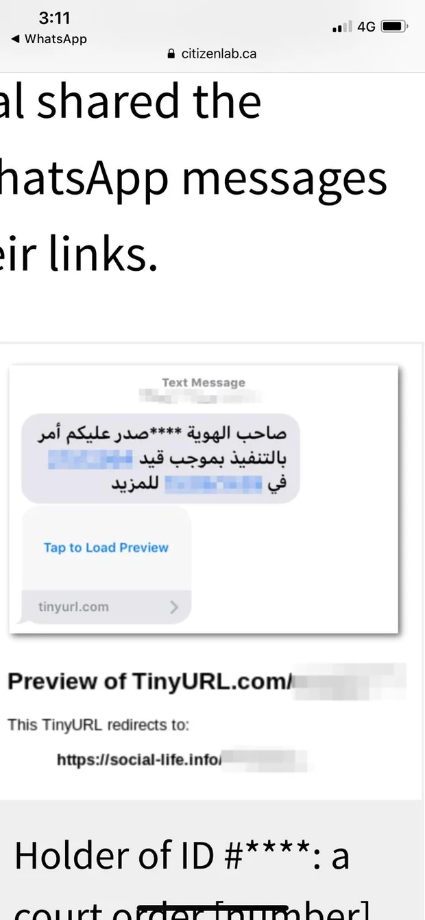Screenshot showing the message sent to Yehia Assiri in an attempt to hack the phone, encouraging him to follow the link disguised as information on a court case. (Yehia Assiri)