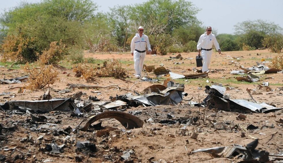 Dressed in protective white overalls, French experts sift through the debris of the Air Algerie plane which is said to have essentially disintegrated over the northern Mali desert.