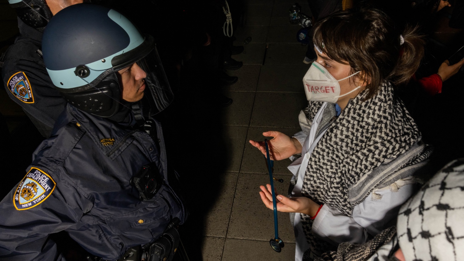 A pro-Palestinian protester holds a stethoscope as they face NYPD officers during a protest on the campus of New York University in New York on 22 April 2024.