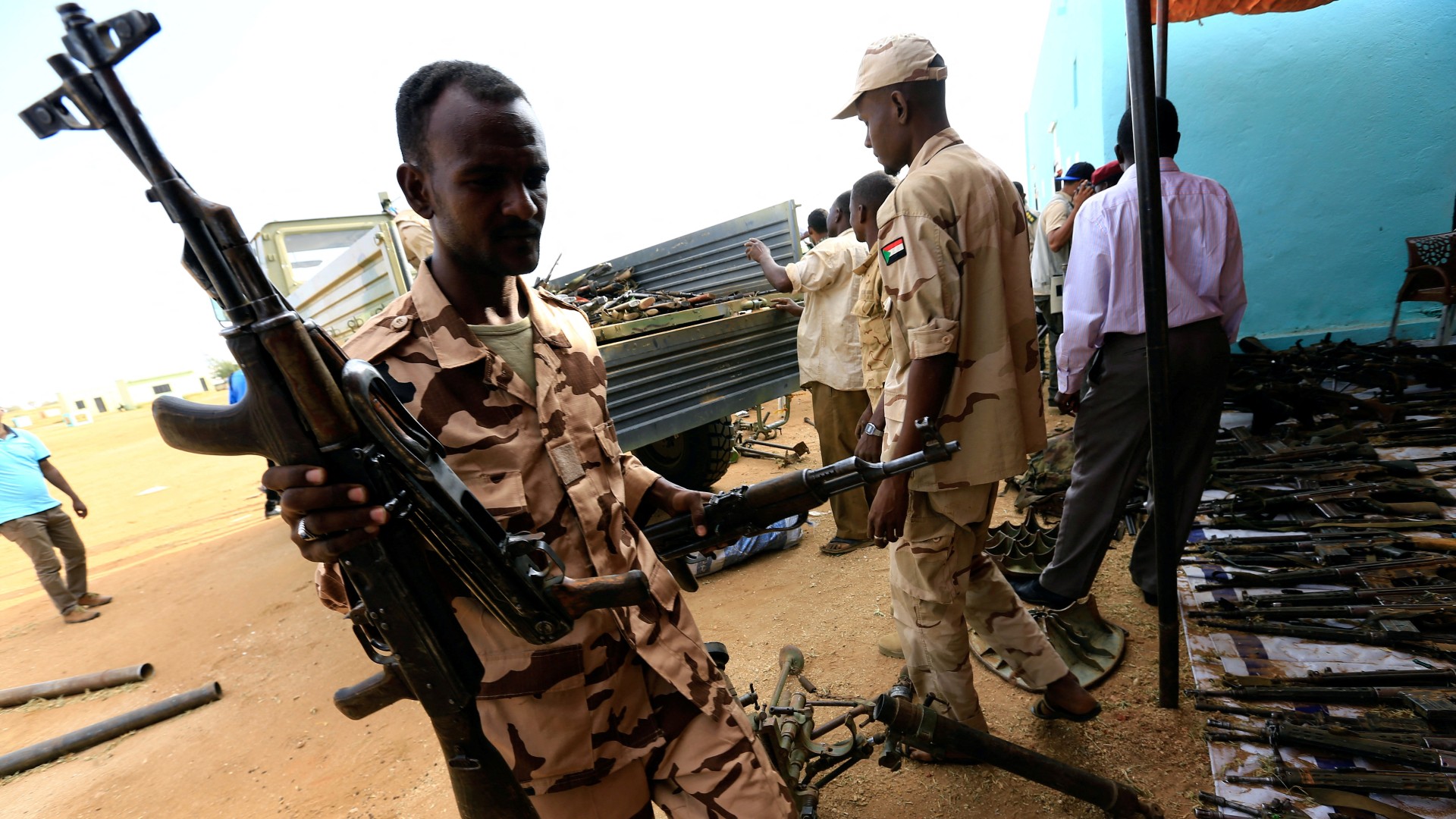 Rapid Support Forces fighters upload disarmed weapons in Umm Al-Qura, Darfur in 2017 (Reuters)
