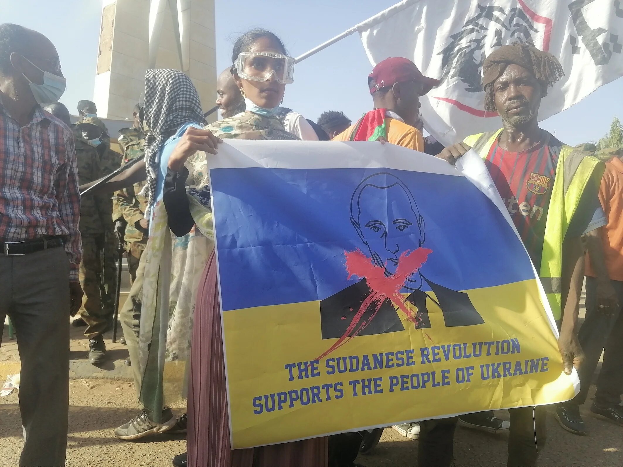 “We have nothing to do with the West or with the East, but we as Sudanese revolutionaries strongly support the people of Ukraine. Our revolution’s main slogan calls for peace for our people and for the nations of the world,” Sara Ahmed, a resistance committee member, told MEE during a protest in front of the Sudanese presidential palace on Thursday.