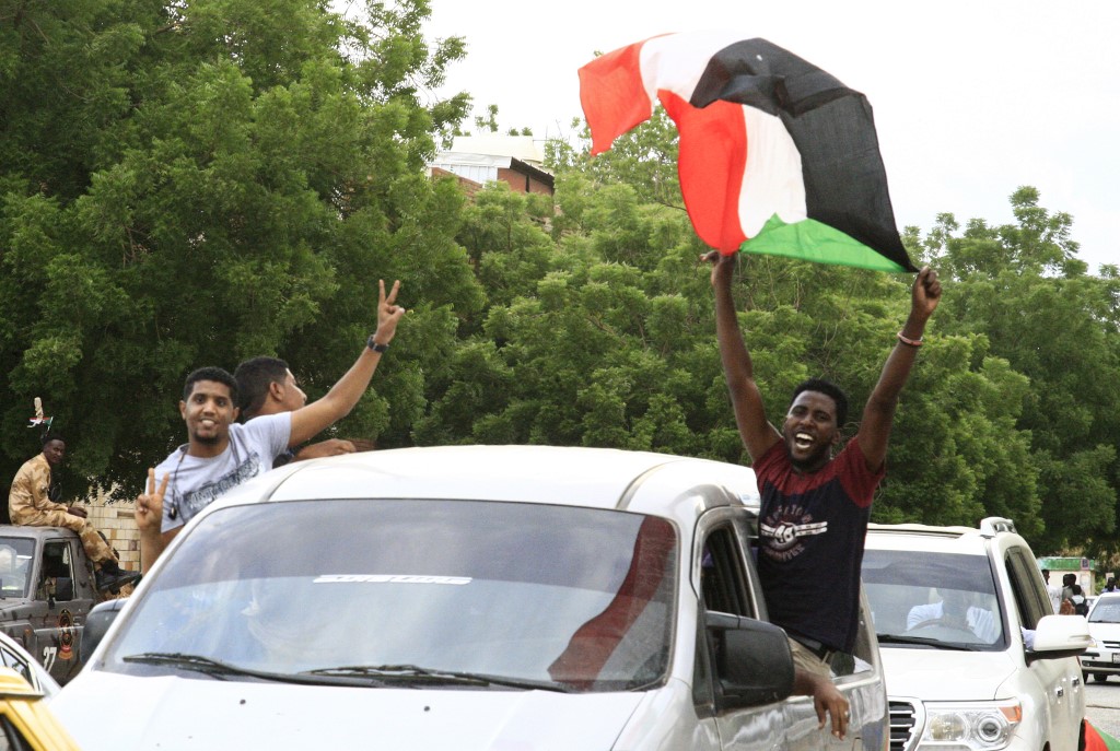 A Sudanese man waves his country's national flag as people celebrate the signing of a transitional constitution on 17 August (AFP)
