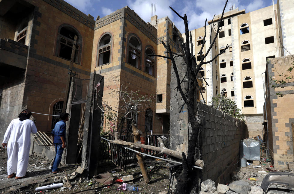 Local residents inspect a building damaged during Saudi-led airstrikes on 27 May (AFP)